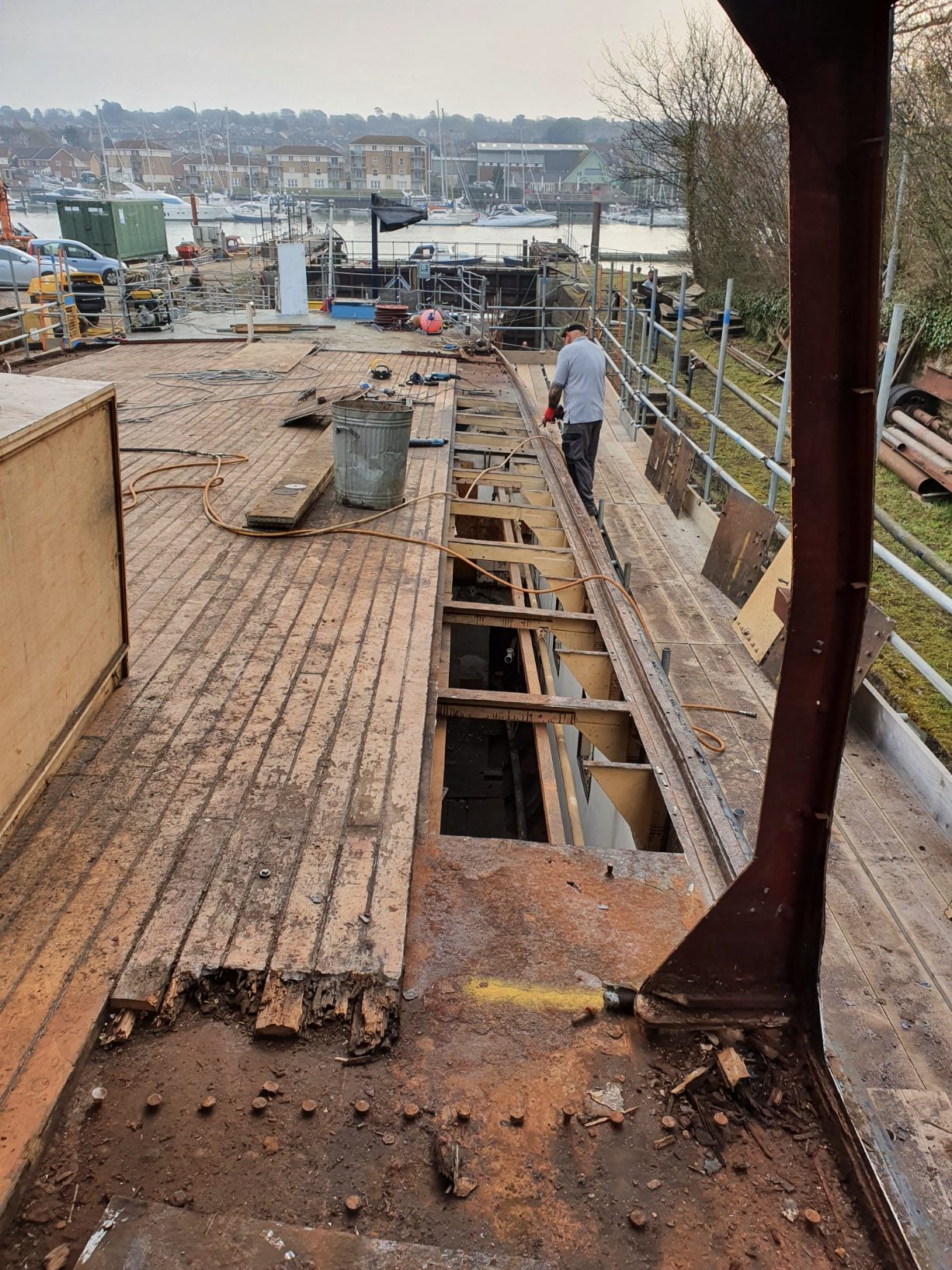 Deck repair works underway, cutting away corroded steel and fitting new……